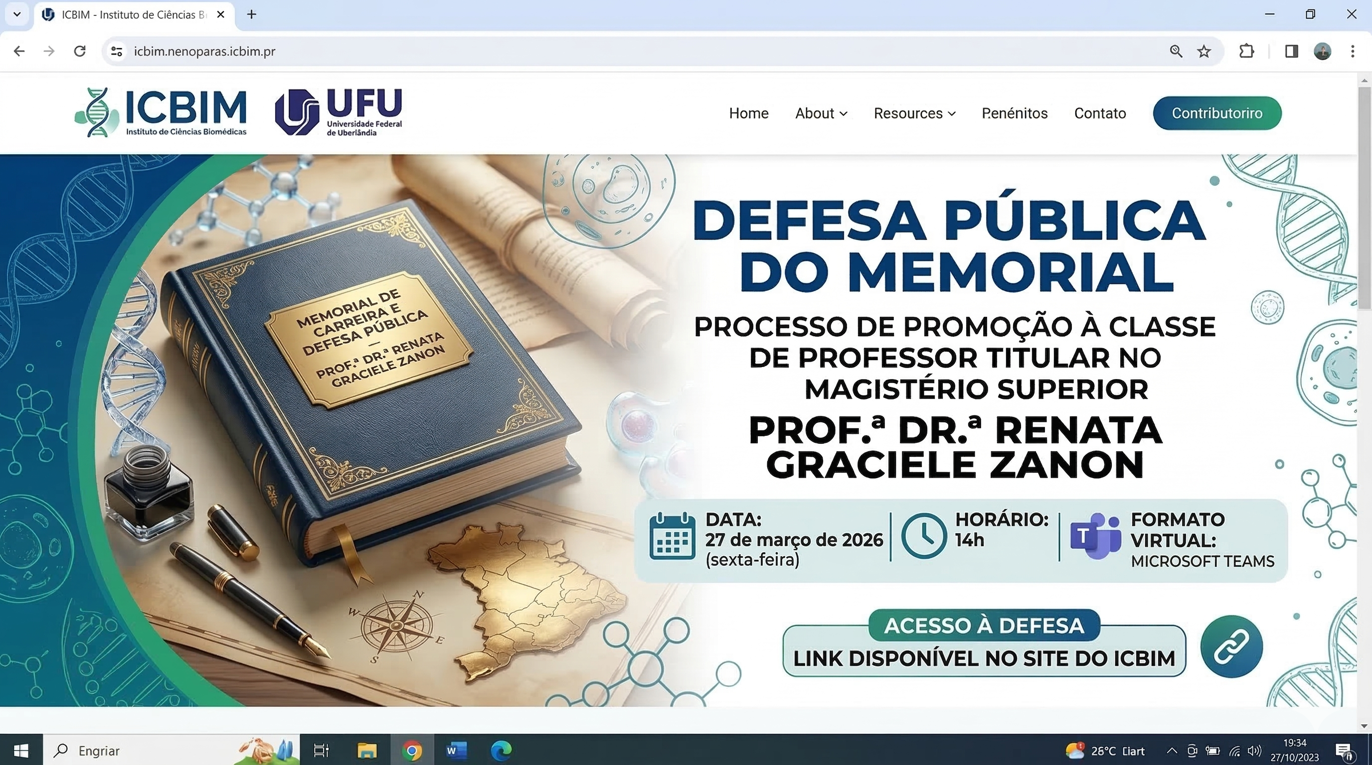 No próximo dia 27 de março, a comunidade acadêmica está convidada a acompanhar a Defesa Pública do Memorial da Prof.ª Dr.ª Renata Graciele Zanon. O evento é uma etapa fundamental e obrigatória do processo de promoção para a classe de Professor Titular, o nível mais alto da carreira docente no magistério superior.